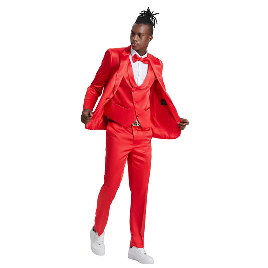 Men's Red Solid Shiny U-Shape Vest Suit