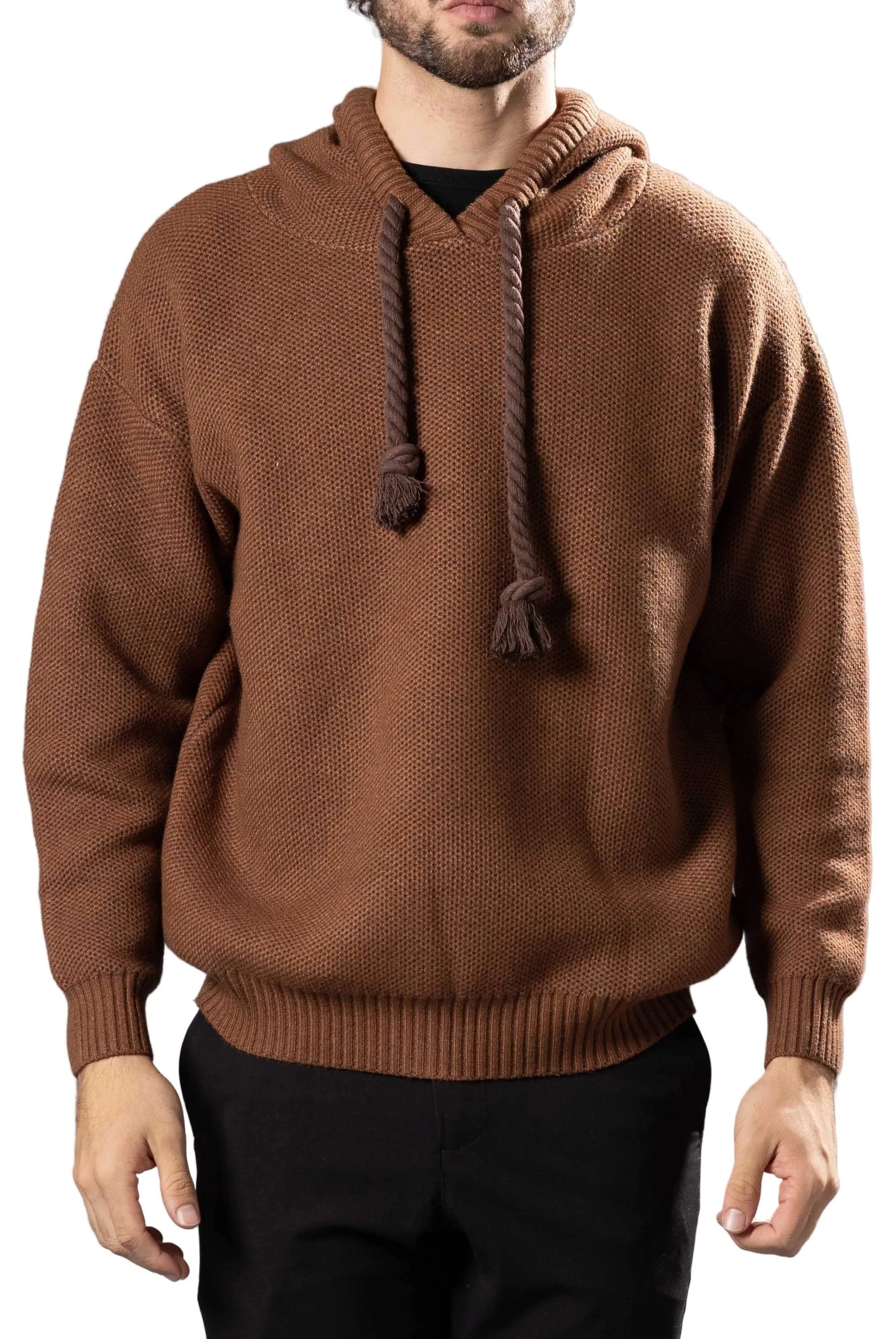 Crafted from textured chunky knit, this Bespoke Moda hoodie delivers exceptional warmth and tactile comfort. The oversized rope drawstrings add distinctive character, while ribbed cuffs and hem ensure a polished silhouette. Its generous pullover design features a spacious hood for versatile layering. Whether styled with joggers for casual ease or paired with denim and trousers for elevated versatility, this piece seamlessly transitions across your wardrobe with understated sophistication.