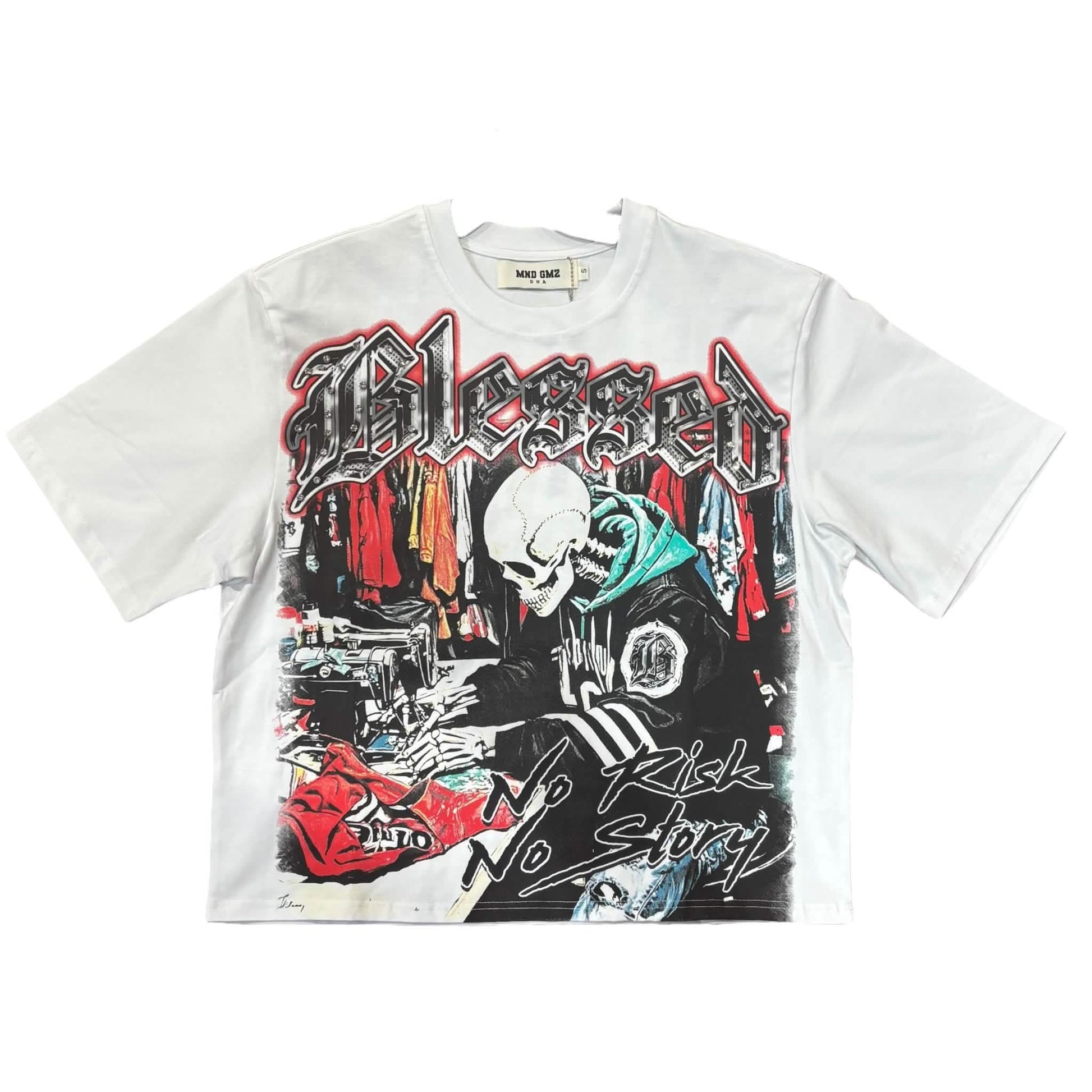 The MND GMZ by DNA – No Risk No Story tee is for the bold only. Fully loaded with graphic artwork and stone-studded shine, this piece reminds ’em that playing it safe don’t make legends. The front rocks the iconic “Blessed” tux skeleton, while the back showcases a story of hustle, risk, and drip. Every detail hits—from the colors to the cuts.