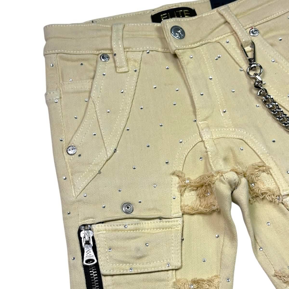 Crafted from super premium denim, these Elite Premium Denim Rhinestone Jeans deliver a bold, flawless fit for the little trendsetters. Featuring daring rip and repair details and a designer washed finish, they command attention. The striking Cuban link chain adds an edgy flair, while each pair is meticulously handcrafted to ensure unmatched quality. Perfect for kids ready to stand out and own their style with confidence.