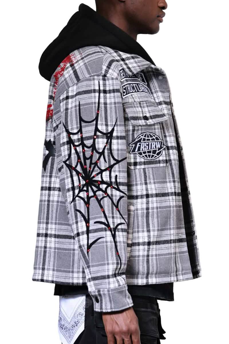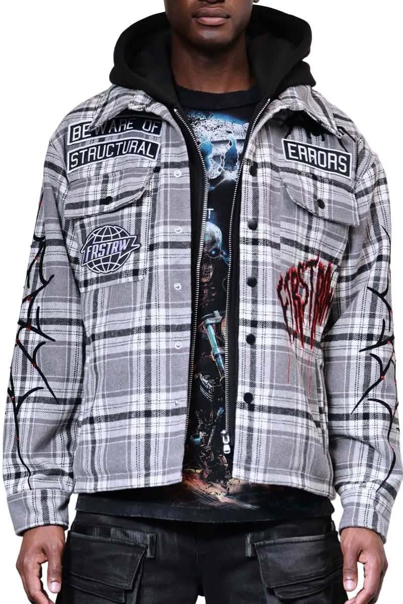 Stay effortlessly cool with the First Row Beware of Structural Errors Shacket. This relaxed fit shirt hoodie jacket combines the warmth of a wool-blended fabric with standout multi patches accented by bold chain stitching. Featuring a snap button and zip center front closure, itβs designed for layered streetwear style and versatile comfort wherever you go.