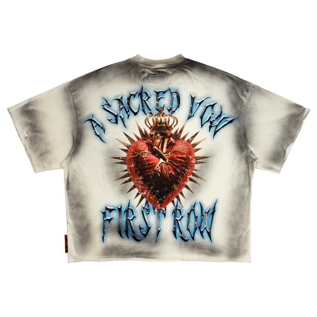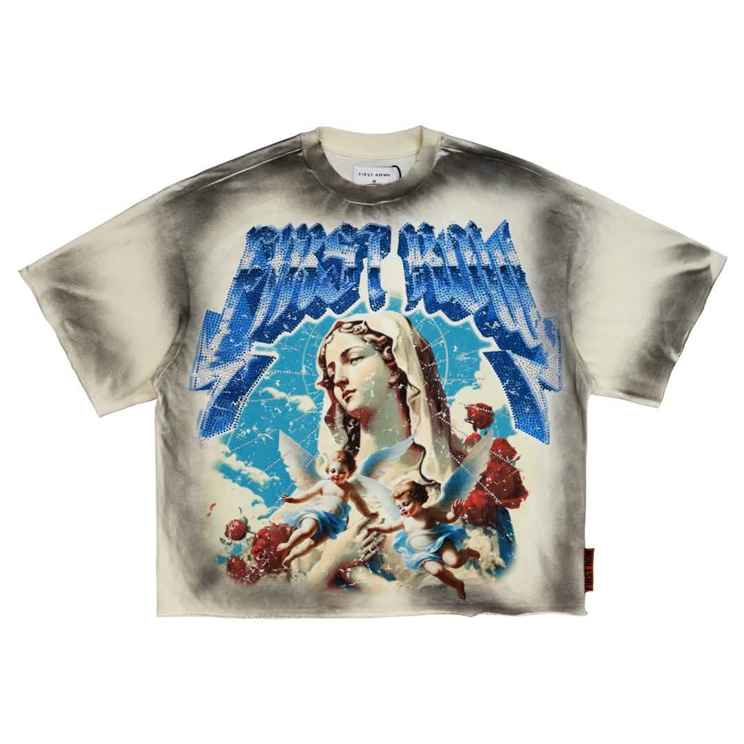 This cropped mini terry T-shirt offers a stylish blend of texture and detailing. Featuring 3/4 sleeves, rhinestone embellishments, applique designs, and rubber print accents, it delivers a distinctive look. The raw edge hem and ribbed neckline enhance its casual yet refined appeal, making it a versatile piece for fashion-forward wardrobes. 100% Cotton.