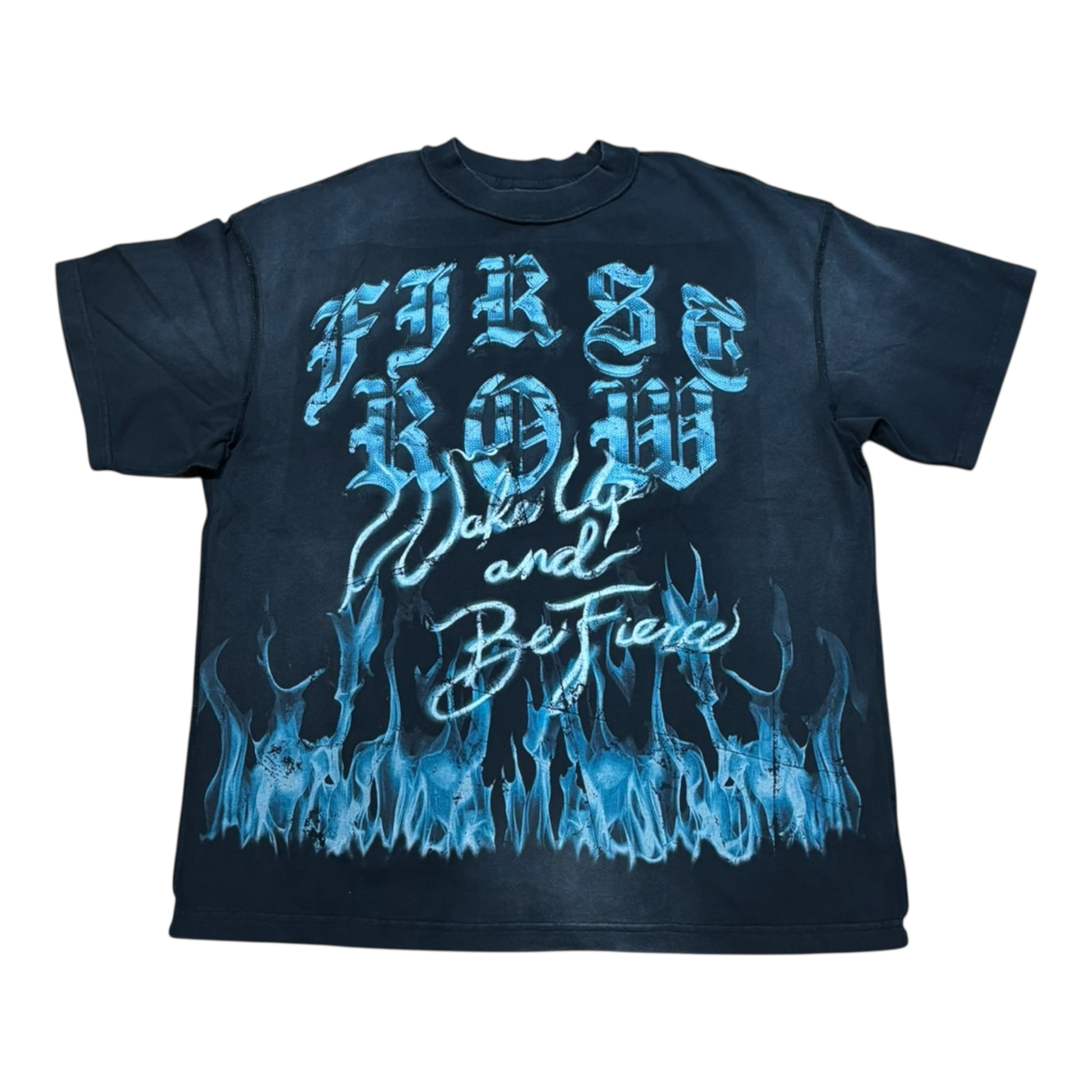 The "First Row Wake Up Flame" t-shirt features a 100% cotton construction for exceptional comfort and breathability. Its heavy washed treatment enhances softness while providing a rugged, lived-in look. The stonewashed graphic adds a unique, vintage touch, making this shirt a durable and stylish addition to any casual wardrobe.