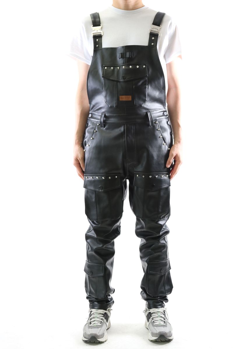 Rock an edgy look with these statement PU leather overalls that demand attention. Built with a bold, structured fit and reinforced metal buckles, they merge practicality with attitude. Spike studs scattered across the straps and body deliver that rebellious vibe, while a contrasting white faux leather patch keeps things visually sharp. Vintage-inspired PU leather construction pairs with adjustable straps for a customizable fit that works as hard as your style does.