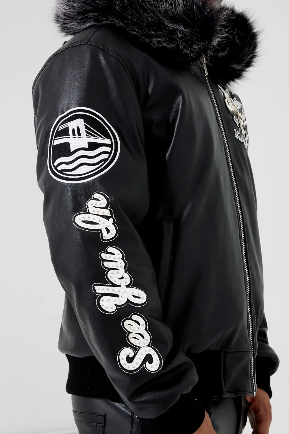 The See You in Paradise Brooklyn Bomber Jacket combines technical construction with refined aesthetics. Engineered with vegan leather and densely quilted padding, this piece provides superior thermal insulation for demanding conditions. The full-zip silhouette allows strategic layering, while concealed side pocket zippers maintain a clean profile. A detachable faux jackal fur collar offers styling flexibility. Intricate rhinestone, embroidery, and chenille patch detailing elevates the design with curated embellishment—a sophisticated take on contemporary outerwear.