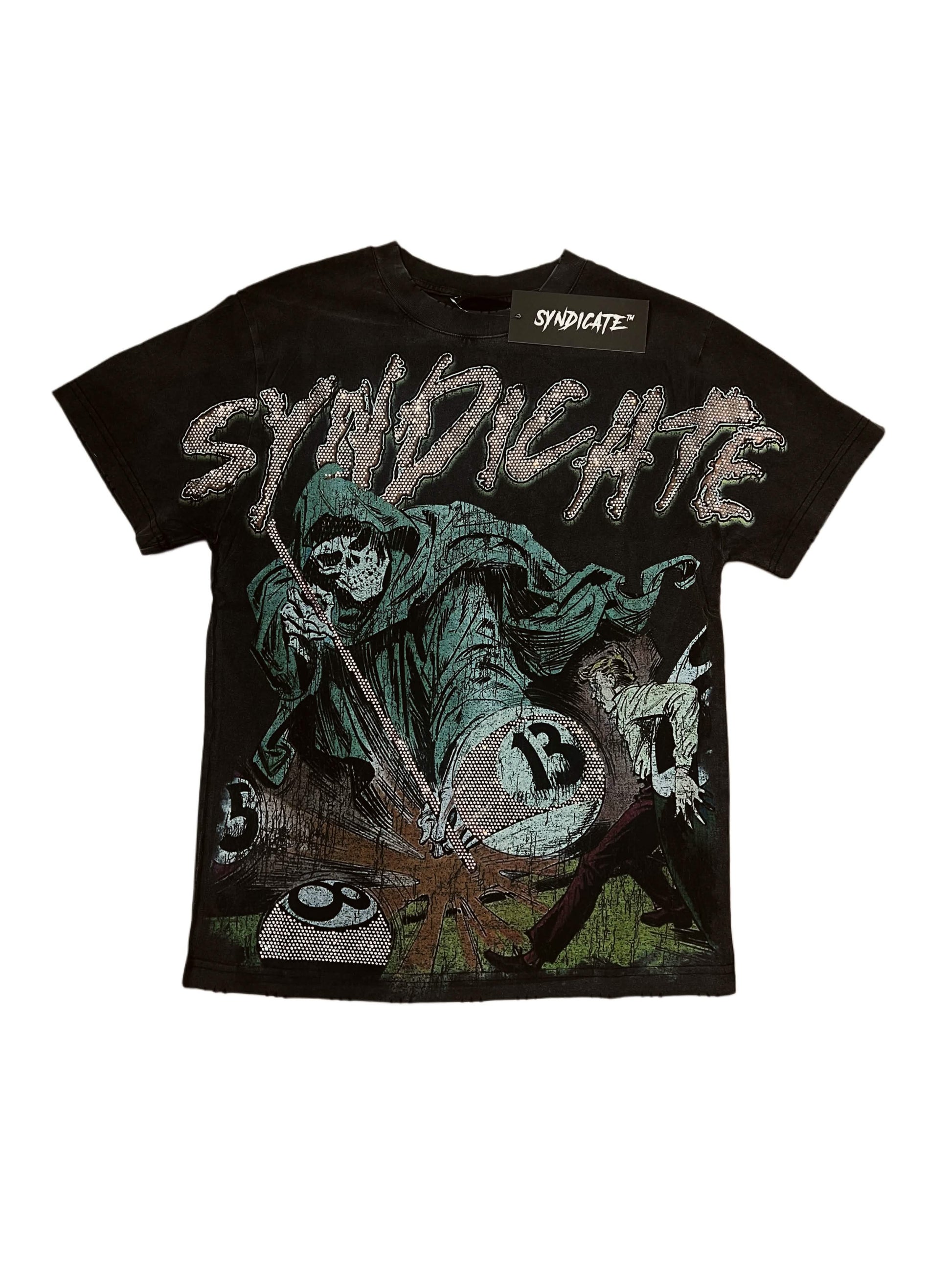 The Syndicate “13” tee brings dark energy and street attitude together in one bold design. Featuring a grim reaper graphic with shattered 8-ball and 13 dice artwork, this tee doesn’t just stand out — it speaks loud. The washed finish gives it a vintage feel, while the oversized print hits hard front and center.